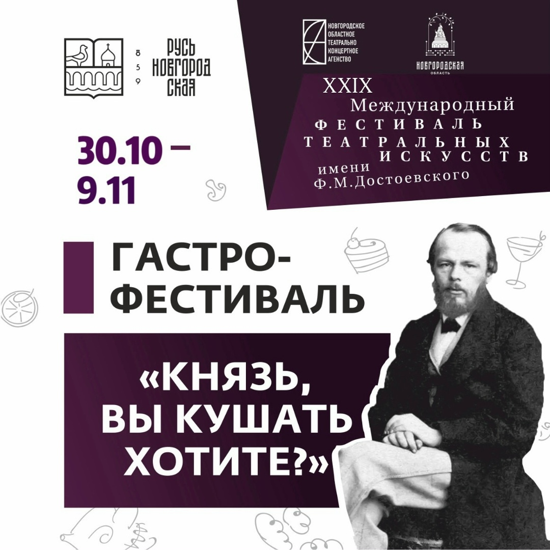 Приготовьтесь к путешествию по вкусам, которое подарит вам незабываемые гастрономические впечатления. Фестиваль «Князь, Вы кушать хотите?» проходит в Новгородской области в рамках XXIX Международного театрального фестиваля Ф.М. Достоевского. В течение двух недель в кафе и ресторанах Великого Новгорода, Старой Руссы и Любытинского района можно попробовать любимые блюда Федора Михайловича Достоевского и героев его произведений. В дни Международного фестиваля театральных искусств имени Ф.М. Достоевского закуски и десерты гастрофестиваля будут продаваться и в буфете Новгородской филармонии. Посещайте театрализованные постановки, дегустируйте блюда из спецменю гастрофестиваля и приобщайтесь к творчеству великого русского писателя! Полный список участников и меню можно подглядеть тут)