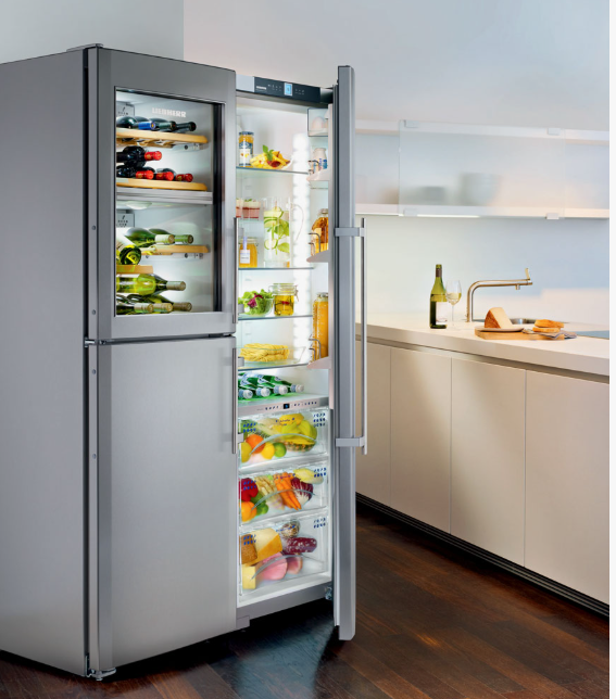 Плюсы: Эффектный вид, удобство доступа к холодильной камере.