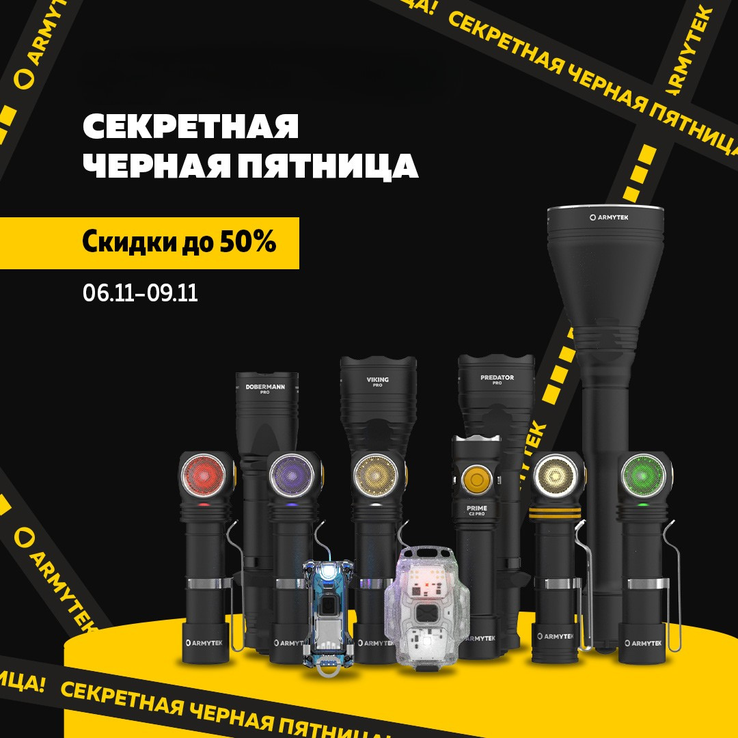 Добрый день! У нас для Вас супер-важные новости и кое-что действительно особенное! Мы запускаем нашу закрытую эксклюзивную акцию, Секретную Черную Пятницу, и она начнется уже 6 ноября! Специально для Ваших подписчиков мы решили увеличить скидку по Вашему уникальному промокоду "Флегантов" до максимальных 50%! https://armytek.ru/sekretnaya-chernaya-pyatnica-2025-ru-5/