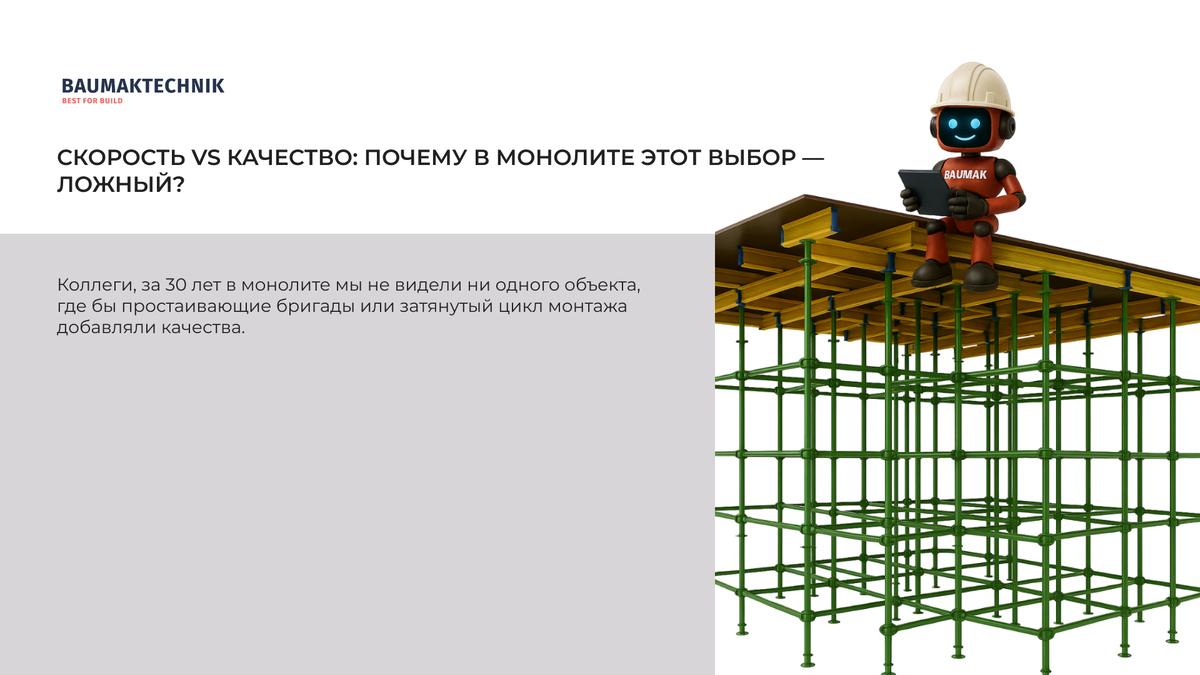 Коллеги, за 30 лет в монолите мы не видели ни одного объекта, где бы простаивающие бригады или затянутый цикл монтажа добавляли качества. Напротив — спешка вслед за потерянным временем лишь усугубляет риски. Но и бесконечно долгая сборка — не выход.