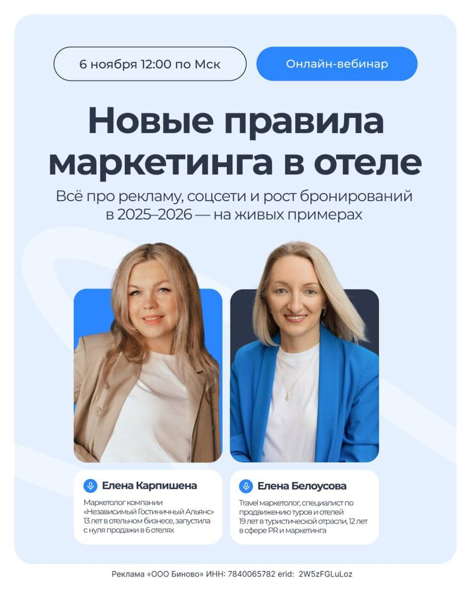Опытные маркетологи туротрасли Елена Белоусова и Елена Карпишена расскажут, как использовать новые правила рекламы для привлечения гостей.