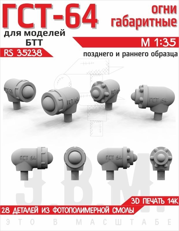 Севастопольская Э.В.М. выпустила на 3D-принтере габаритные огни ГСТ-64 раннего и позднего образцов для моделей советской БТТ в масштабе 1/35. Габаритные огни ГСТ-64 раннего и позднего образца (каталожный номер RS35238)
