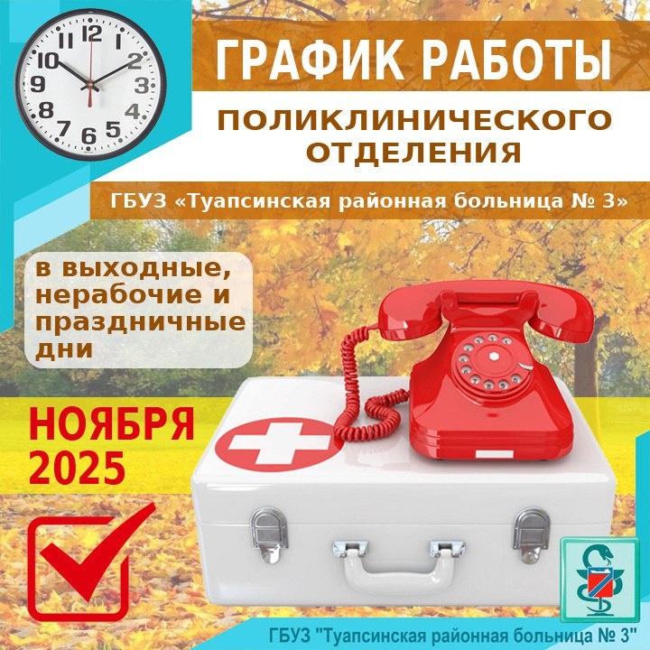 ГРАФИК РАБОТЫ ПОЛИКЛИНИКИ ГБУЗ "ТУАПСИНСКАЯ РАЙОННАЯ БОЛЬНИЦА № 3" В ВЫХОДНЫЕ И ПРАЗДНИЧНЫЕ ДНИ В предстоящие выходные, нерабочие и праздничные дни (2-4 ноября 2025 года), наша поликлиника будет осуществлять работу по оказанию неотложной медицинской помощи - ежедневно с 8 до 18 часов. Вызвать бригаду скорой медицинской помощи можно по телефону: 03 - для стационарных телефонов; 103 - для мобильных телефонов; 112 - единый номер. 3 и 4 ноября 2025 года - выходные дни. Справки по телефону регистратуры поликлиники 8 (86167) 7-13-14.
