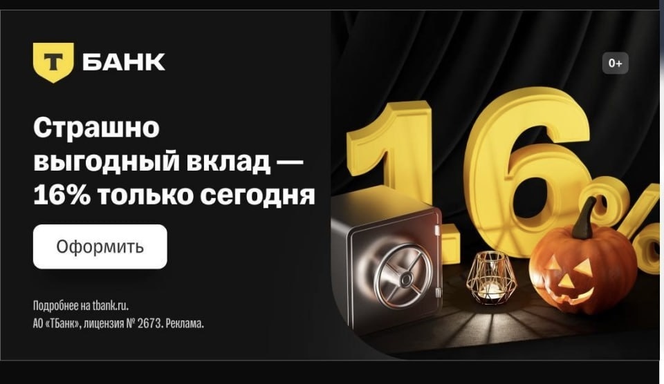 Только сегодня (31 октября) в Т-Банке можно открыть «Страшно выгодный вклад» на 13 месяцев под 16% 🔸Ставка – 16% годовых (с капитализацией 17.34%) 🔸Срок – 13 месяцев. 🔸Сумма – от 50 тыс до 1 млн. 🔸Ежемесячная выплата % – на вклад или на счёт карты (через поддержку можно изменить в течение срока вклада) 🔸Всего можно открыть до 8 вкладов, но общий лимит по ним не должен превышать 1 млн рублей. ☝️Главное успеть открыть вклад до конца сегодняшнего дня и пополнить от 50 тысяч рублей — чтобы зафиксировать ставку в 16%. » Далее можно пополнить вклад в течение 30 дней до 1 млн рублей на клиента. 💡Лайфхак: Если планируете класть 1 млн, то чтобы в случае "острой необходимости" денег не трогать всю сумму, можно открыть несколько вкладов на меньшие суммы!