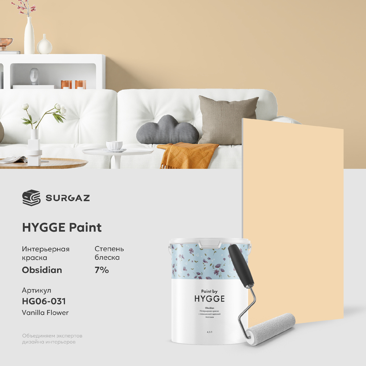 В интерьере использован цвет «Vanilla Flower» HG06-031 из авторской палитры HYGGE Paint, отражающей природные оттенки тепла и комфорта.