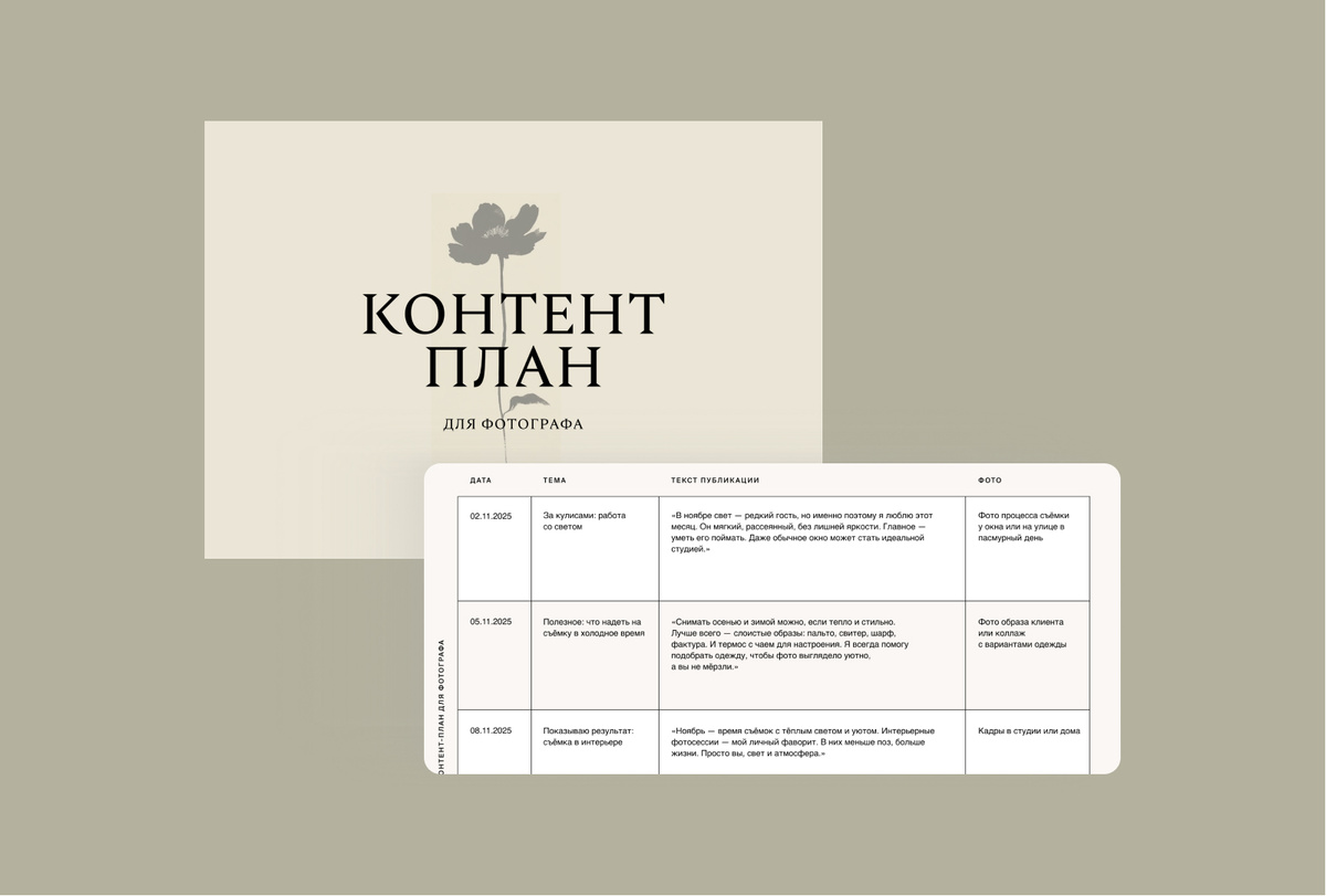 Ноябрь – месяц красок и контрастов: золотая осень уступает место первым снежным заморозкам, а природа окутана нежным туманом 🍂 Это идеальное время для создания волшебных фотографий, которые будут напоминать о красоте осеннего сезона и уютной атмосфере первых зимних дней! Чтобы у вас оставалось больше времени на фотосъемку, мы подготовили контент-план для ведения соцсетей за вас! С помощью нашего списка тем вы сможете легко подготовить контент на ноябрь и привлечь новых клиентов. Дата / Тема / Текст публикации / Рекомендации по фото Все готово! Просто добавьте свои идеи и публикуйте. Vigbo — первый сервис для фотографов на русскоязычном рынке, с 2011 года упрощаем работу мастеров и помогаем привлекать клиентов. Наша миссия — больше счастливых фотографов и красивых историй. Бесплатные галереи для передачи съемок, онлайн ретушь и сайт-портфолио для фотографов – всё в одном месте! Регистрируйтесь >> Если материал вам был полезен, просто кликните на 👍 и делитесь с друзьями ссылкой ❤