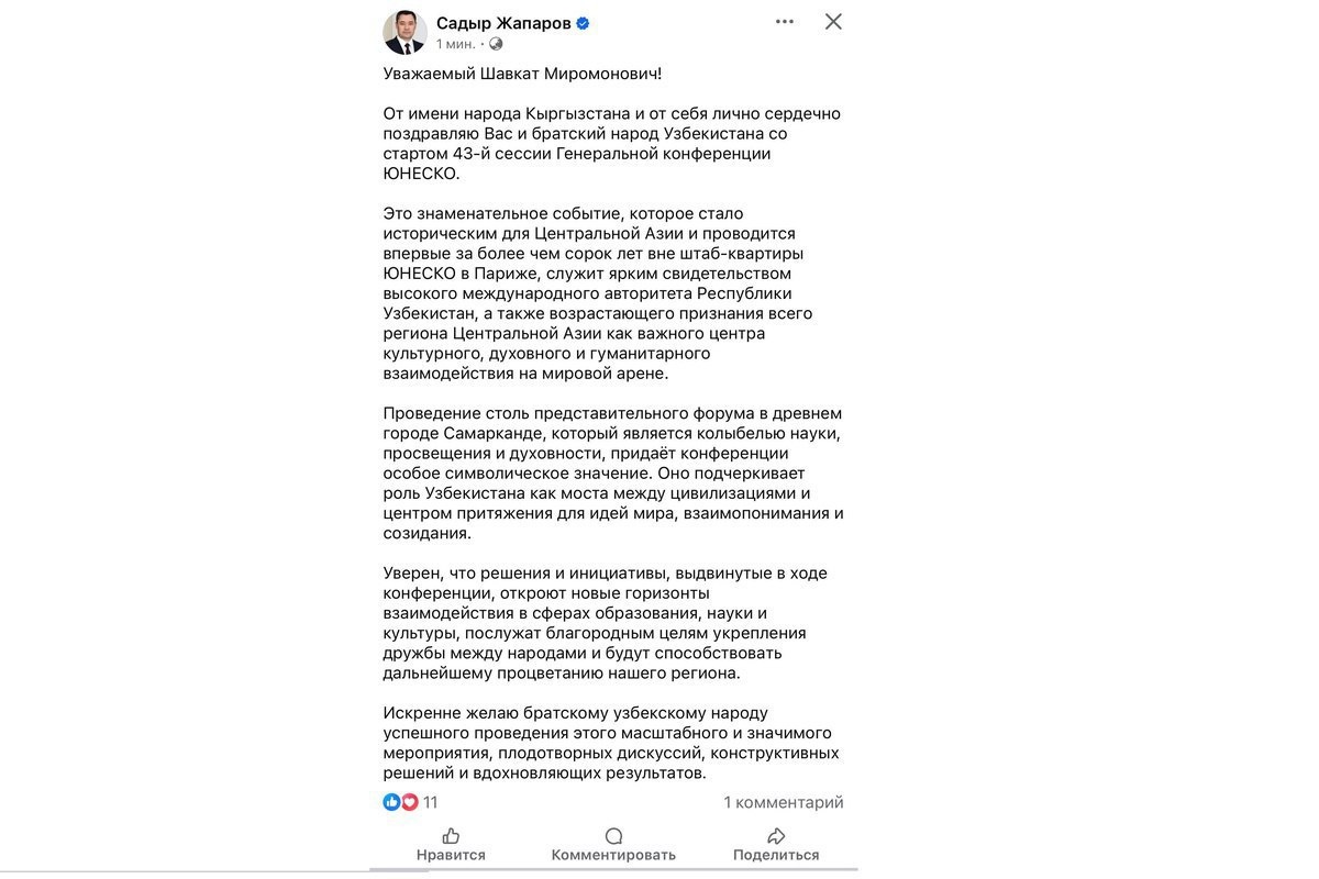 “YUNESKO sessiyasining Samarqandda o‘tkazilishi O‘zbekistonning xalqaro maydondagi nufuzi ortib borayotgani ifodasidir”— Sadir Japarov Qirg‘iziston rahbari Shavkat Mirziyoyev va O‘zbekiston xalqini YUNESKO Bosh konferensiyasi 43-sessiyasi boshlanishi munosabati bilan tabrikladi. @daryolive