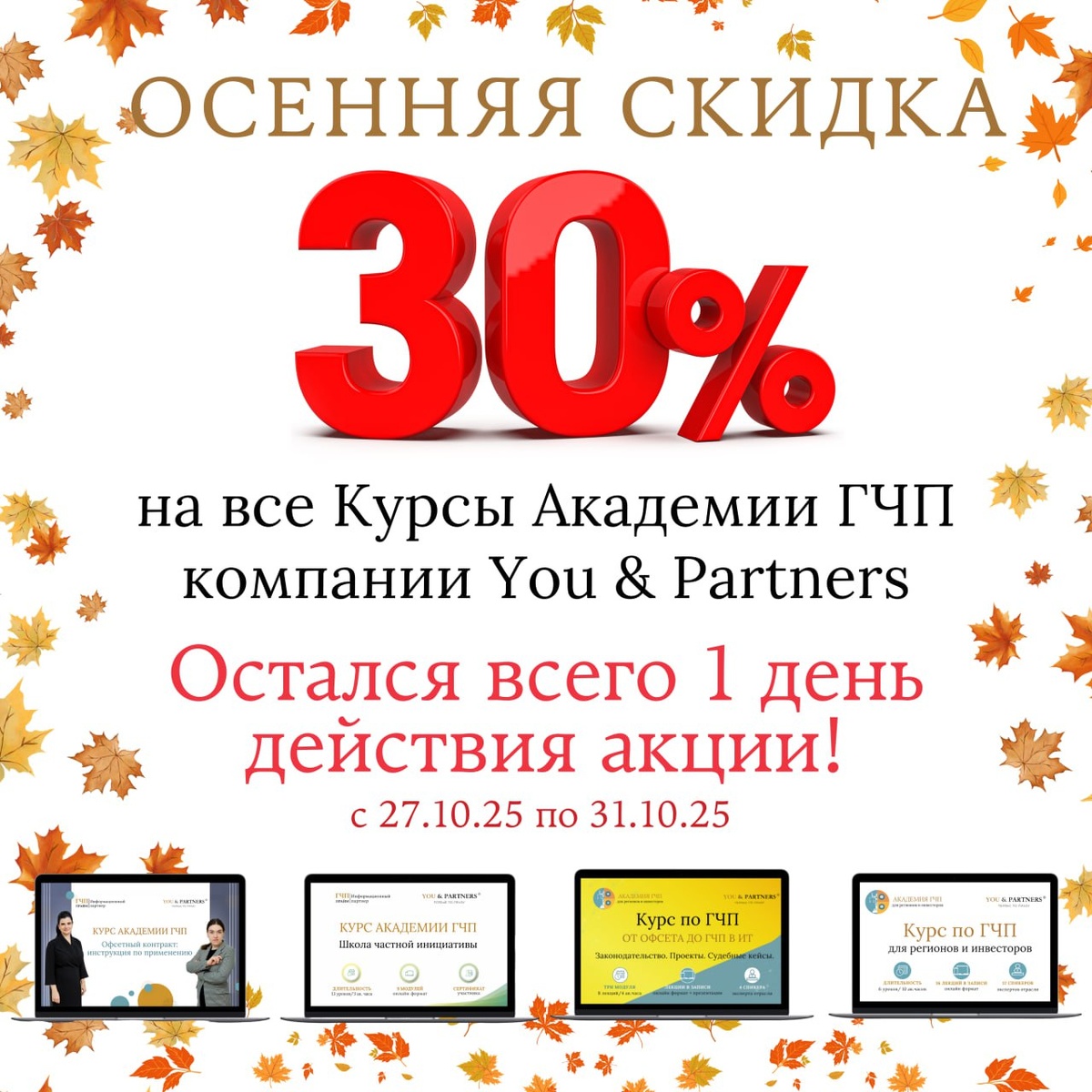 Академия ГЧП напоминает о завершение акции — 30% скидке на все Академии ГЧП компании You & Partners!