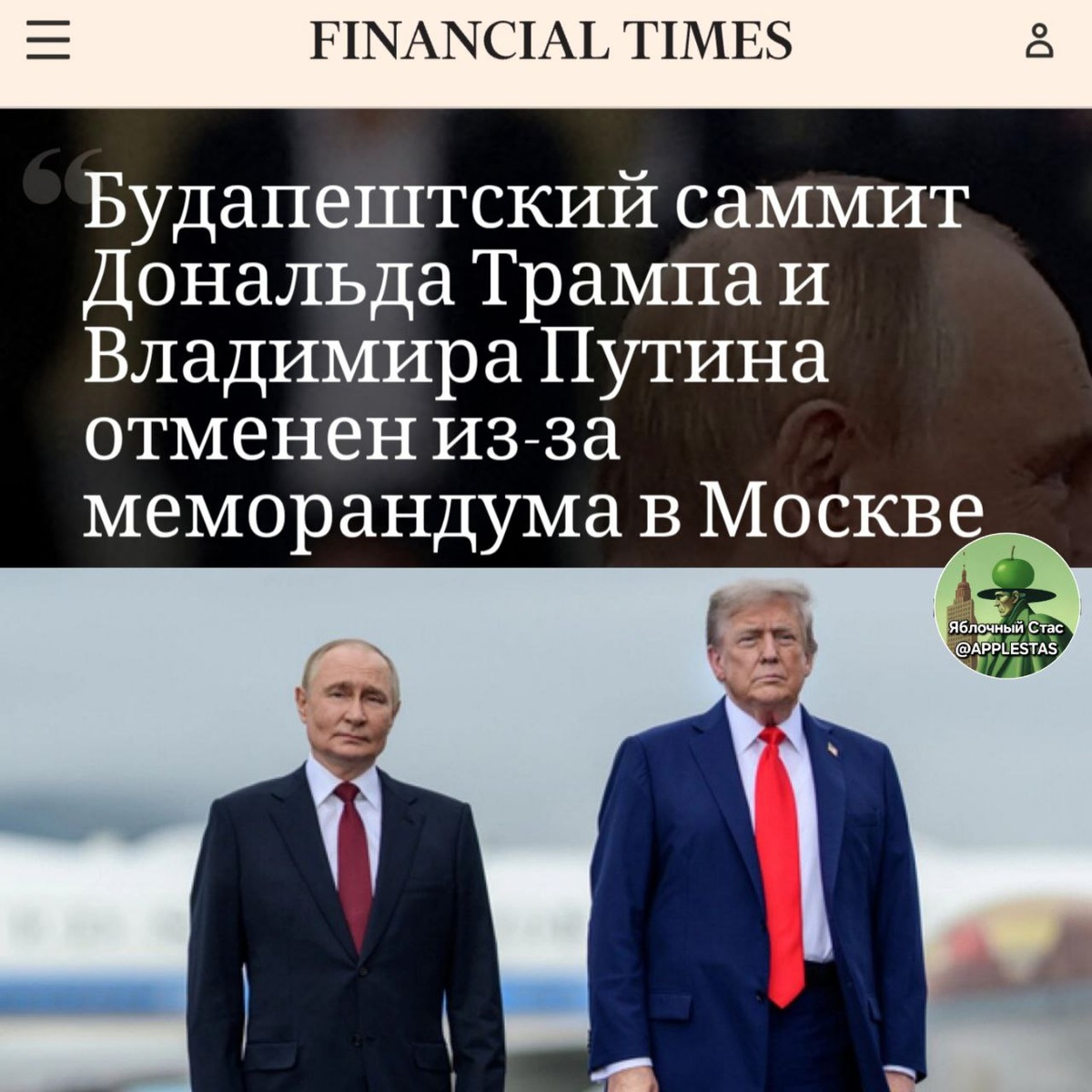 Без Будапешта. Боевой листок Файнэншл Таймс сообщает, что встреча Владимира Путина и Дональда Трампа окончательно отменена. Причина в "требованиях России" о территориальных уступках, демилитаризации и невступлении в НАТО. Нет, ну вы подумайте, какая наглость. Россия побеждает и не хочет просто взять и уйти на полпути. Ах да, и еще репарации заплатить. Это же полное попрание миропорядка, основанного на правилах. Плевок в цивилизованный мир. Яблочный Стас