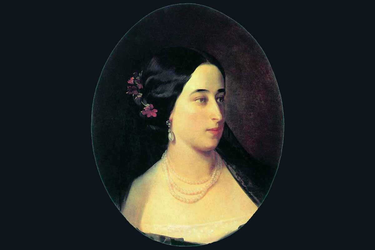 Александровна изображена с жемчужным ожерельем, доставшимся ей от матери, и гирляндой анютиных глазок в волосах.