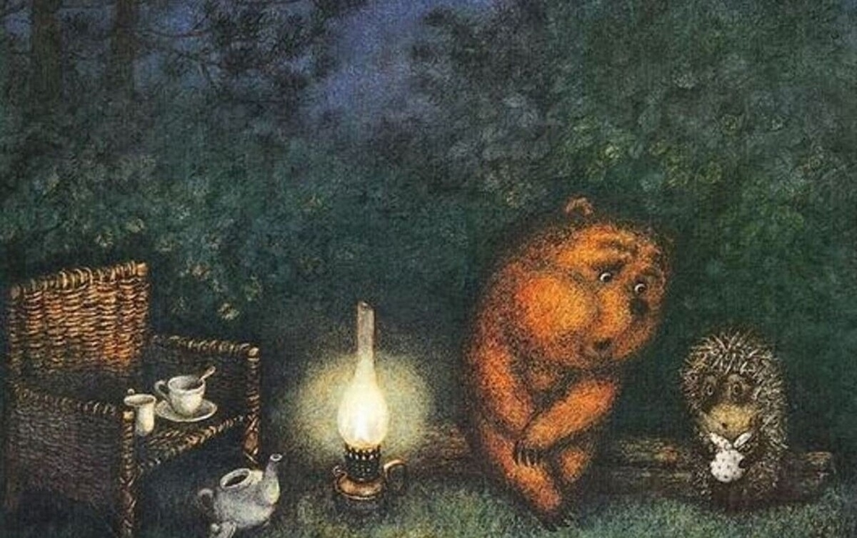 Такие они лапочки – и Ежик, и Медвежонок. Сидят на бревнышке, беседуют о чем-то задушевном, искренне, просто. Тихие, ласковые, добрые. Наивные и смешные. И вот это плетеное креслице с чашками, и волшебный свет лампы, и темная зелень, переходящая в синеву, вокруг – такое все мирное, ласковое. Боже, сколько человеческой любви в этом мультфильме!