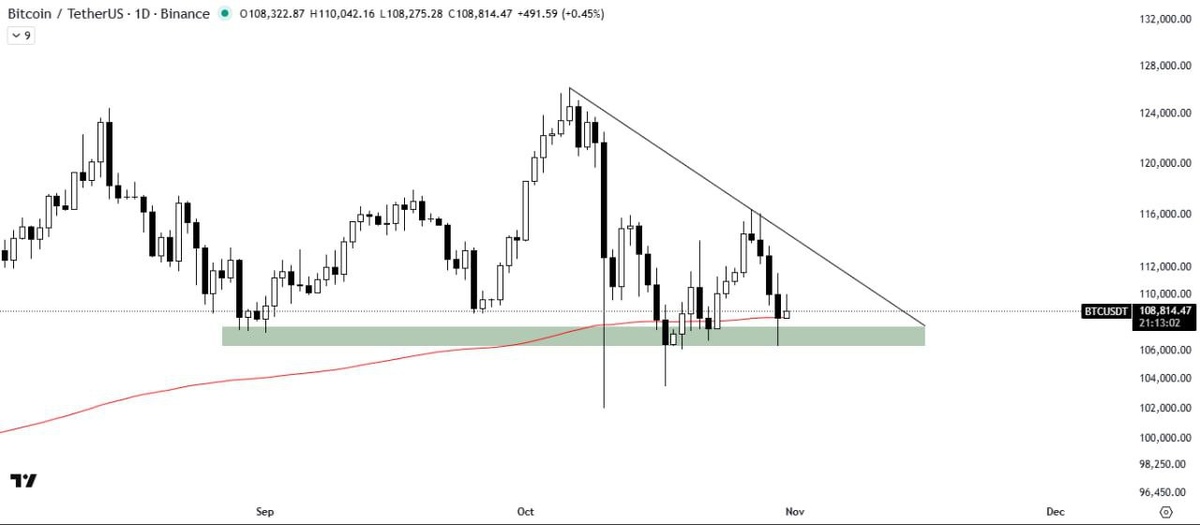 #BTC/USDT АНАЛИЗ Биткойн сталкивается с отторжением от линии сопротивления нисходящего треугольника. В настоящее время он торгуется выше горизонтальной зоны спроса, где 200MA выступает в качестве сильной поддержки. Здесь можно ожидать потенциальный отскок, однако пробой ниже зоны спроса укажет на дальнейшее движение вниз.
