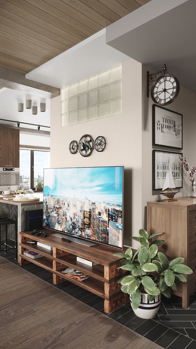 ТВ композиция. Центральным местом всего этого пространства является ТВ-зона, которая служит разделяющим элементом между входной и кухонной зонами. ТВ-тумба выполнена интересным образом: опорами для дубовых полок выступает старинный, полнотелый кирпич. Наличие стеклоблоков и черной напольной плитки дополняет индустриальный дизайн особым шармом. Проект - #АЧ_ЛОФТ_эволюция