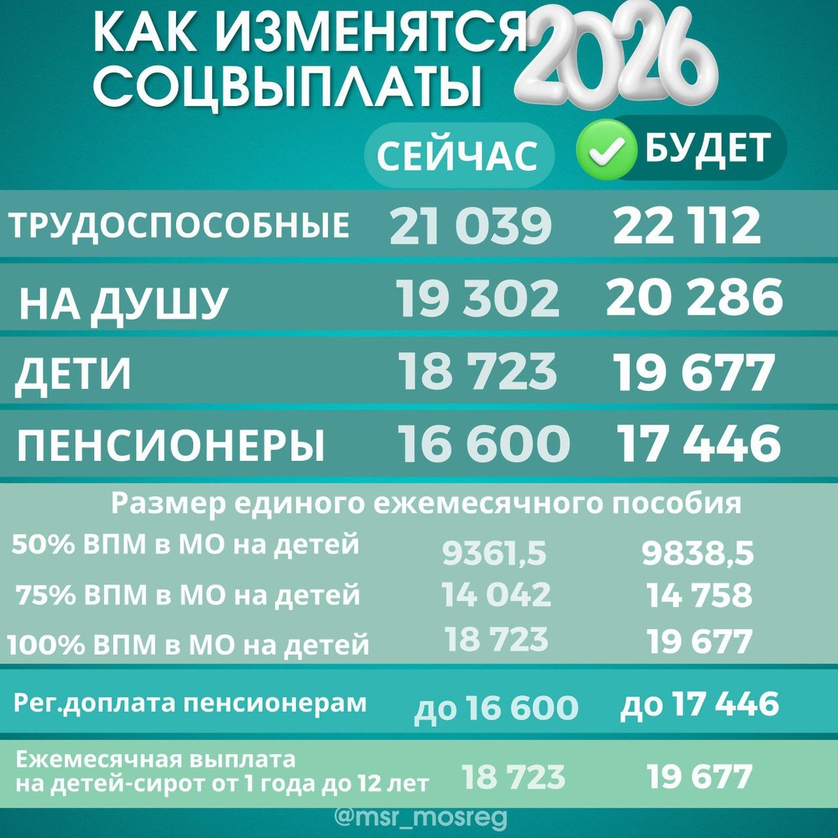 ⚡️ С 1 января 2026 года в Подмосковье увеличится прожиточный минимум. Вместе с ним ряд социальных выплат станет больше. Увеличение прожиточного минимума способствует увеличению размера выплат и пособий, таких как: единое пособие на детей, соцпомощь, доплата к пенсии и многие другие. В нашем регионе более 690 тысяч жителей получают различные виды социальных выплат, которые индексируются с увеличением прожиточного минимума, — министр социального развития Подмосковья Андрей Кирюхин Подробнее: https://t.me/msr_mosreg/5998