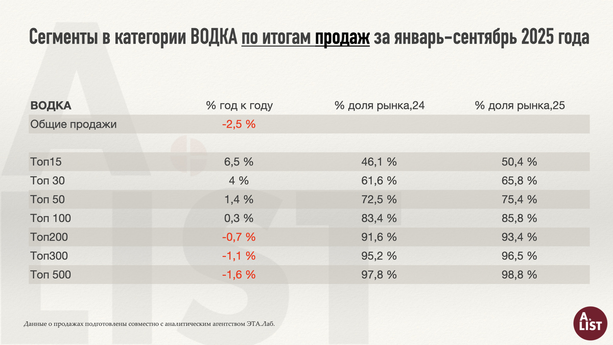 Комментарий к материалу «Коммерсантъ» Под разговоры о «борьбе с алкоголизацией населения» рынок перестраивается в пользу крупных сетей и нескольких десятков сильных брендов. Речь не только о здоровье потребителей. Речь о структуре сбыта. И хотя наш комментарий опирается на ситуацию с водкой, те же тенденции формируются и в категории бренди, виски, ром и джин — с поправкой на специфику категорий. 1. Фискальный. Акцизы и НДС растут. Минимальная розничная цена на водку сейчас — 349 ₽ за 0,5 л (40%), в 2026 году ожидается около 400 ₽. За январь–сентябрь 2025 года продажи водки по объёму упали на 2,5%, но 15 крупнейших брендов выросли на 6,5%. Их доля уже 50,4% рынка против 46% годом ранее. Покупатель не стал трезвенником — он просто покупает реже и выбирает «известное». Региональные марки вылетают, а на полках всё чаще появляются виски, джин и другие крепкие напитки с большей маржой для сетей. 2. Сетевой. Федеральные сети стараются не играть в локальную экзотику. Им нужны объёмы, стабильно