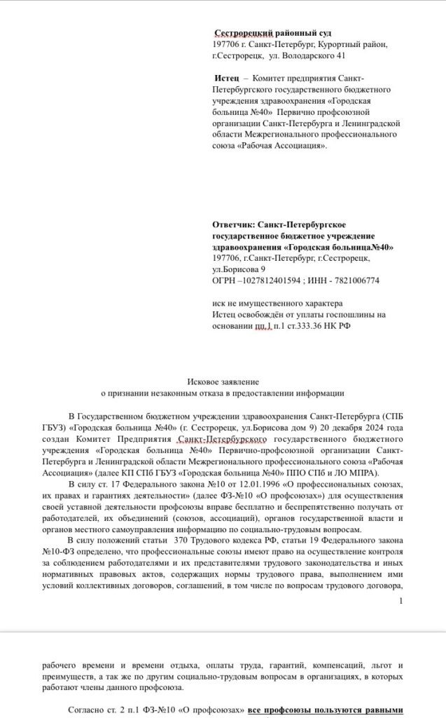 Профсоюз инициировал судебное разбирательство в отношении руководства больницы №40. Причиной послужил отказ администрации предоставить информацию, которую запрашивал профсоюзный комитет, сообщает «Комитет предприятия профсоюза МПРА в «ГБ №40». Иск подан в связи с тем, что Комитетом предприятия был направлен ряд запросов о предоставлении информационных документов, в том числе штатного расписания. Данные сведения необходимы для осуществления профсоюзом его уставных функций: контроля за соблюдением трудового законодательства и приказов Минздрава, анализа социально-экономической ситуации для формирования требований к работодателю, а также для разработки проекта коллективного договора. Несмотря на то, что законодательство Российской Федерации обязывает работодателя предоставлять запрошенную информацию профсоюзам для защиты трудовых прав, руководство больницы №40 отказалось предоставить запрошенную информацию. Исковое заявление направлено с целью признания этих действий незаконными. Ранее в