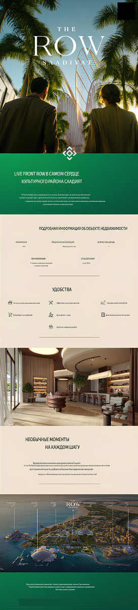 В The Row Saadiyat жизнь разворачивается как на сцене. Культовый адрес, где архитектура, благополучие и культура соседствуют друг с другом. В нескольких шагах от вдохновения и самовыражения на каждом шагу, в окружении престижных художественных и исторических музеев, где представлены уникальные дизайнерские концепции и впечатления. Эта жизнь создана для лучших.