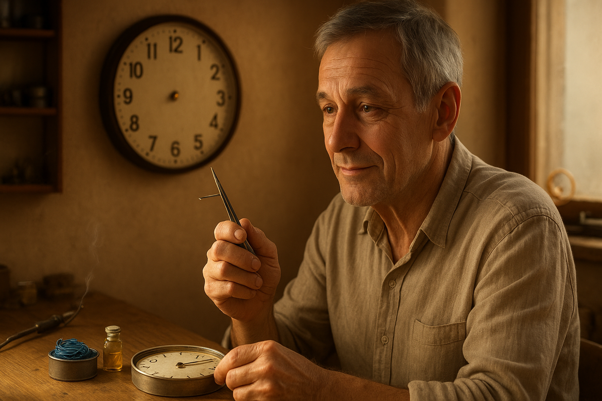 Он включил лампу — молочный круг лёг на стол и поймал бликом баночку со смазкой. Пальцы слушались по привычке: подхватить пинцетом винт, поймать резьбу, задержать дыхание. «Время стоит», — спокойно подумал он. Внутри это звучало точнее: «Стою я». Но тиканье, как пульс, упорно шло.