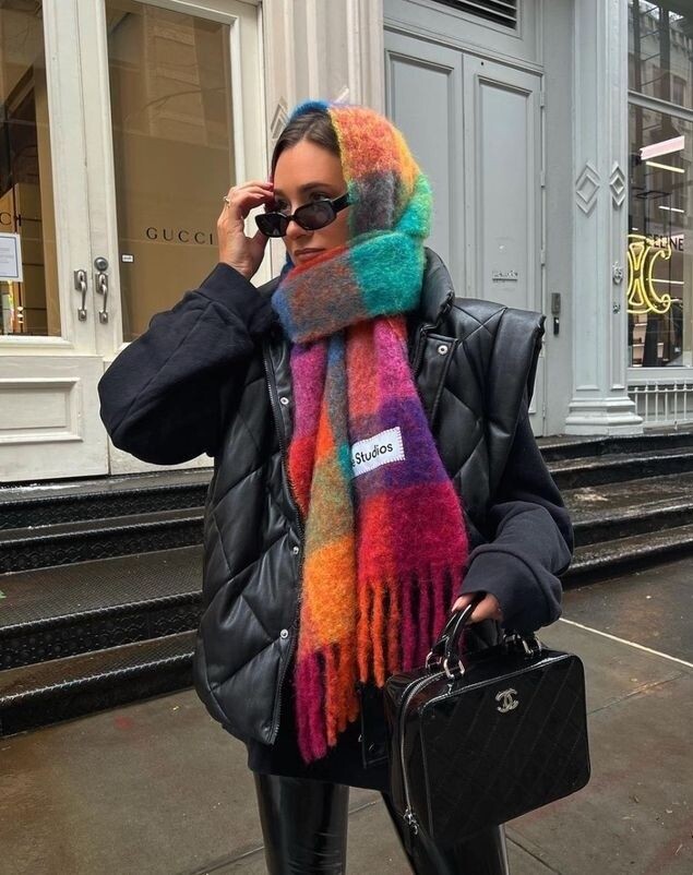 - Если верхняя одежда однотонная и лаконичная — дайте шарфу немного свободы: лёгкий принт, мягкая клетка, фактура.
