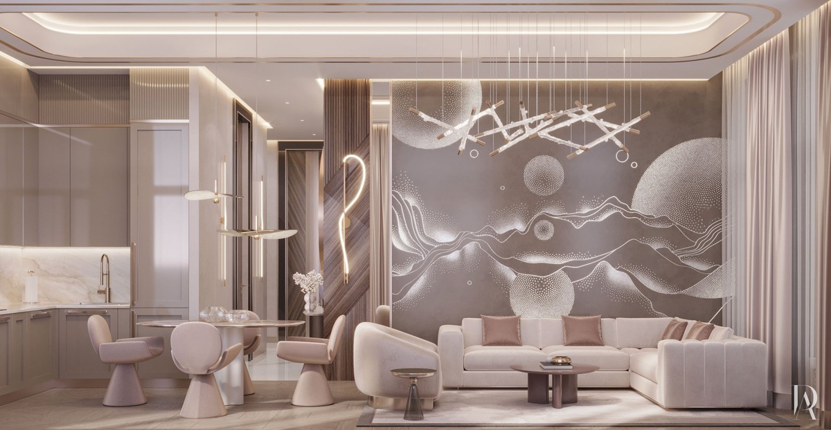 Главным декоративным элементом в интерьере кухни-гостиной стала авторская фреска, в рисунке которой присутствуют космические мотивы. Она тоже выполнена в бежевой гамме и занимает всю стену за диваном, создавая в помещении особое настроение, и играя роль фона для светлой мягкой мебели.