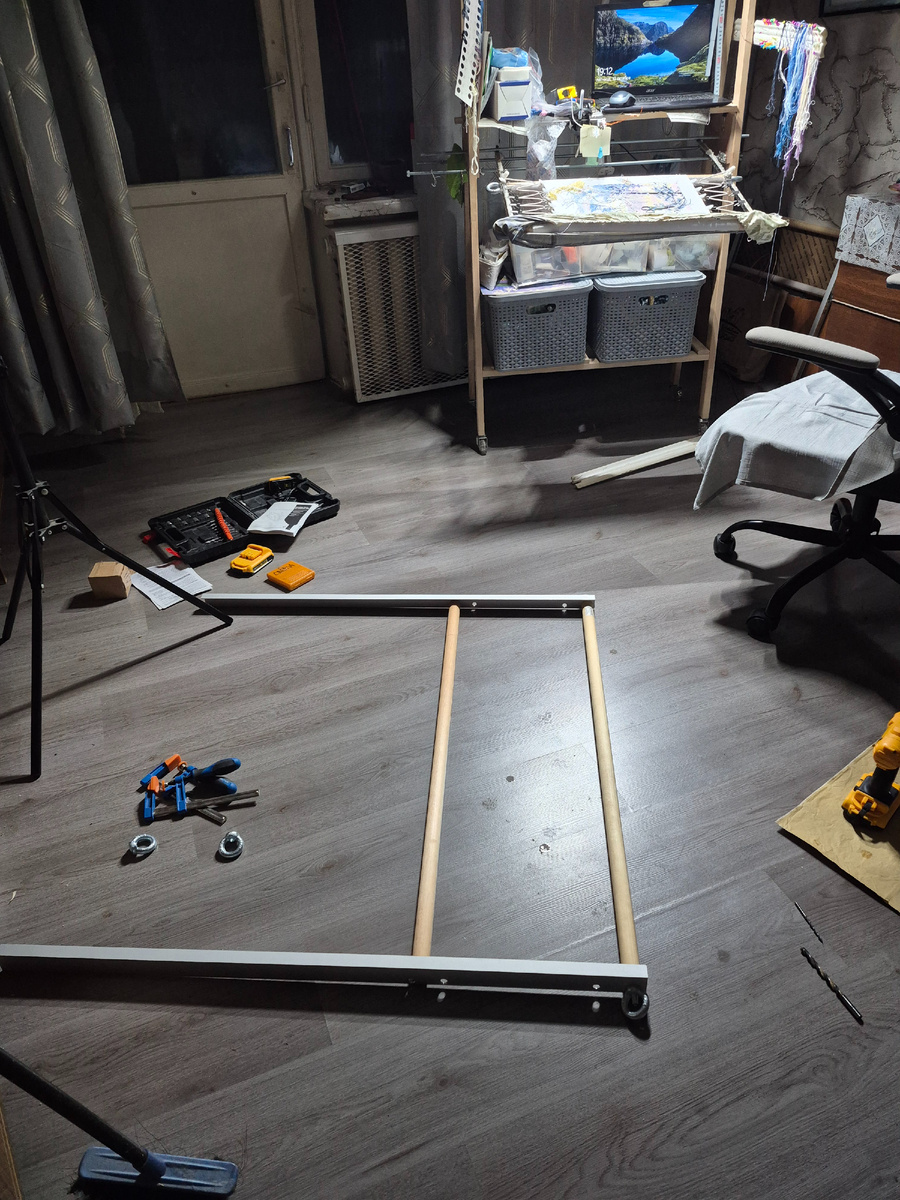 И вновь я достал что сверлит-стучит-визжит и сильно шумит — инструменты. Снова дырки сверлом в черенках чтобы их нарастить и та-дам... Фсё, теперь точно канва поместится, фуххх, выдохнул и хотел лечь спокойно поспать, как — упс!!! Так я вернулся к тем же баранам что было в начале, когда рама метровая, шпильки метровые и чудо конструкция (рама) не держится на чудо (станке)...🤣🤣🤣
