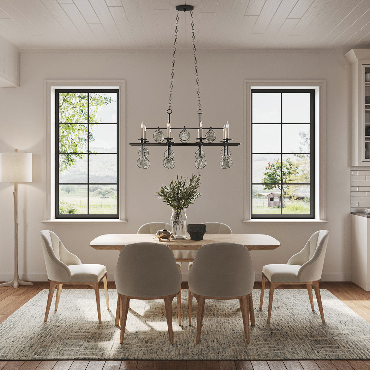 Коллекция светильников SETHOS от Currey & Company представляет собой яркий пример современного дизайнерского подхода к освещению. В эту элегантную серию входят две модели люстр и настенное бра, каждая из которых гармонично сочетает стиль и функциональность. Основой коллекции служит изящный металлический каркас с черной отделкой, который формирует утонченные «ветви», на которых расположены свечообразные лампочки. Этот элемент не только создает эффект мягкого, рассеянного света, но и добавляет динамики в общий дизайн. К тому же, круглые прозрачные стеклянные пластины, выполненные из переработанного стекла, придают светильникам уникальную текстуру и визуальную легкость, подчеркивая их современный характер. Светильники SETHOS идеально подойдут тем, кто ищет свежие решения для своего интерьера и хочет уйти от традиционных канделябров. Их необычный и стильный вид станет акцентом в любом помещении, будь то гостиная, кухня, спальня, столовая или кабинет. Эта коллекция прекрасно впишется в разн