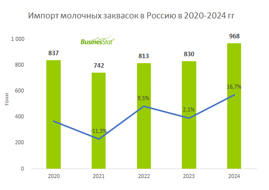 В 2024 г импорт молочных заквасок в Россию вырос на 17% и достиг 968 т.