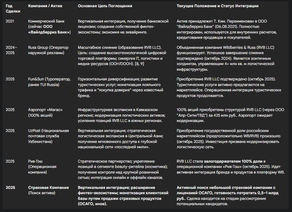 💰 Экспансия Wildberries Последнее время часто вижу новости, что ВБ кого-то купил или планирует. Последняя такая новость про Рив Гош Мне стало интересно собрать и посмотреть куда движется наш фиолетовый гигант 🚢 Зачем WB скупает аэропорт и УзПост? Компания агрессивно инвестирует в инфраструктуру: логистический комплексы, контроль над UzPost и аэропортом «Магас». Плюс — планы на страховое направление. Это подготовка к масштабной экспансии в Азию, Африку и на Ближний Восток Я вижу цель WB так: стать логистическим и финансовым конгломератом через стратегию M&A (слияния и поглощения) 🌍 К чему готовиться селлерам? Для нас это сигнал: скоро ФБО будет глобальным. Маркетплейс строит систему тотального контроля над товаропотоком, превращаясь в "способ жизни" для клиента Больше инсайтов в моих каналах: Телеграм, Дзен, VK P.S. Помните, мы обсуждали ставки в РК? Скоро будем обсуждать CPO в дирхамах😁
