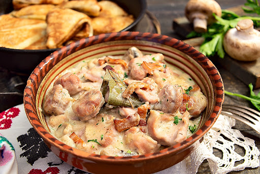 Гречку выложи горкой, сверху — мачанку с подливой. Сочное, ароматное мясо в бархатистой сметанной подливе, идеально сочетающееся с рассыпчатой гречкой. Блюдо, которое согревает изнутри — классика белорусского стола.