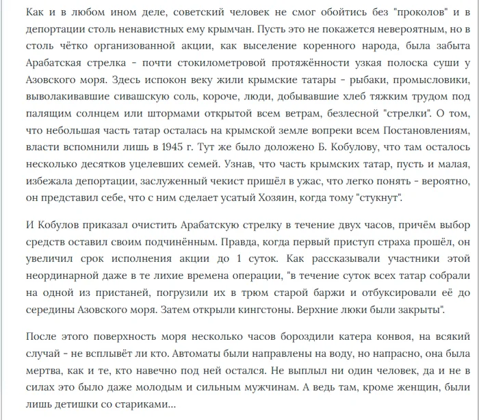 Что же касается утопленных якобы крымских татар, то распространители этой байки, часто путаются в показаниях, для примера на скриншоте ниже видно, как человек пишет, что Крым вообще обезлюдел, а потом внезапно, местные власти обнаружили что на Арабатской стрелке, есть аж несколько селений, откуда крымских татар не выселили после чего приняли решение, погрузить их в баржи и утопить в Азовском море. Если раньше говорилось об одном селении, жителей которых утопили, то теперь появилось аж несколько селений, правда откуда взялись эти несколько селений, и как они назывались, не знают даже распространители этой байки.