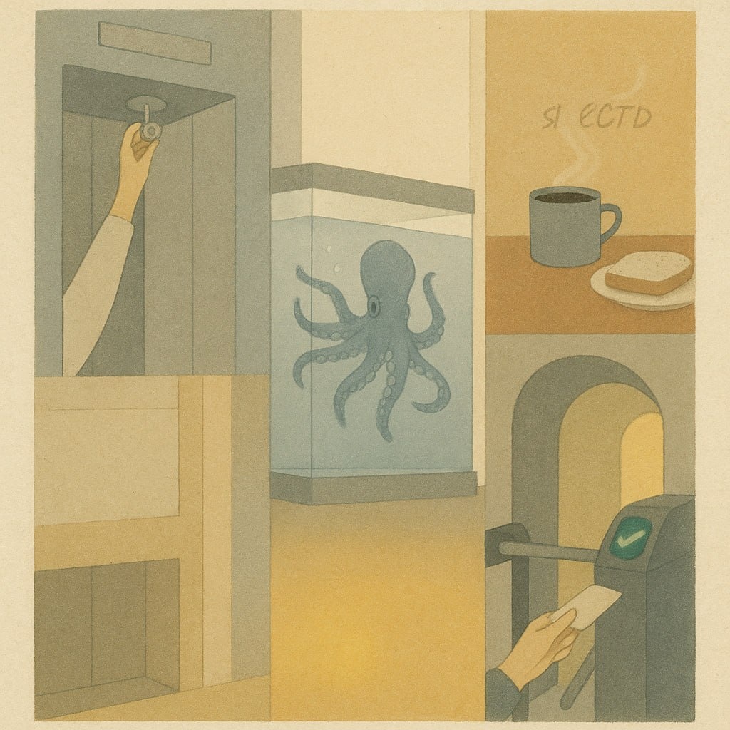 Здравствуйте, дорогие подписчики! Продолжаю рубрику про анонимные кейсы и сны. Публикуется с разрешения моей клиентки. Детали изменены для сохранения конфиденциальности. Сон, который мне принесли на сессию: "Сначала снится лифт. Двери закрываются, панели с кнопками нет, кабина останавливается между этажами. Под потолочной крышкой находится маленькая ручка. Ею получается аккуратно довести лифт до уровня пола и выйти. Затем появляется комната с большим аквариумом. Вода чистая и тихая. В теле поднимается удушье, как будто в груди сидит осьминог. Я отхожу на шаг и вижу, что он снаружи, присосался к стеклу. После этого возникает простая кухонная сцена у мамы. Чай, хлеб с маслом и спокойное, теплое молчание. В финале появляется арка с турникетом. Пытаюсь пройти по билету, но билет пробит не до конца. Ещё одно касание и проход открывается." Контекст терапии Мы работаем с темой хронического напряжения и с ощущением, что всё нужно контролировать и при этом никого не нагружать своими чувствами.