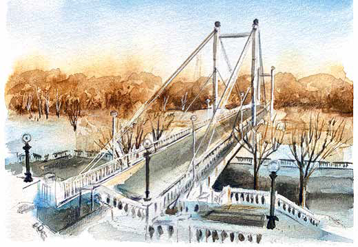 Текст: Анна Масленникова. Иллюстрации: Ксения Онуфриевич Среди степей Южного Урала стоит старинный Оренбург, основанный как город-крепость в 1743 году. Он известен пуховыми платками, тем, что почти полгода его осаждало войско Емельяна Пугачева, но он так и не сдался, а еще здесь бывали Василий Жуковский и Александр Пушкин, учились Мстислав Ростропович и Юрий Гагарин. ДОРОГА: Из Москвы до Оренбурга можно добраться фирменным двухэтажным поездом «Оренбуржье» № 032 Москва — Орск. Перейти границу. Пешеходный мост через реку Урал — одна из визитных карточек города. Эта переправа символично соединяет Европу и Азию, о чем свидетельствуют стелы, установленные на месте, где условно сходятся две части света. С «европейской» стороны к мосту ведет парадная лестница, построенная в 1950-е годы в стиле сталинский ампир, а на «азиатской» находится парк «Зауральная роща». Изучить архитектуру. Советская — главная туристическая улица города. Во время прогулки по ней можно увидеть Гостиный двор, здания го