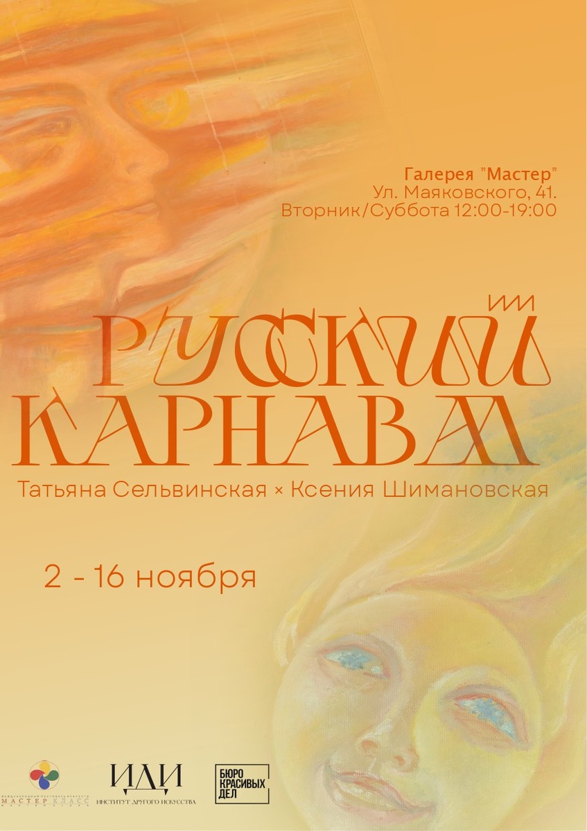 В прошлом году на площадке «Бюро красивых дел» прошла выставка известного московского театрального художника Татьяны Сельвинской. Ее творчеством заинтересовались многие, посетившие экспозицию, и вот… 2 ноября в день рождения Татьяны Сельвинской открывается более масштабная экспозиция работ этой художницы и её ученицы Ксении Шимановской. Выставка называется «Русский карнавал». Она создана усилиями Института Другого Искусства (Москва), «Бюро красивых дел» и галереей «Мастер», любезно предоставившей свою площадку и поддержавшей наш проект в лице Тамары Семёновой, руководителя этой галереи. Институт Другого Искусства, в коллекции которого находится более 70-ти работ Сельвинской, предоставляет около 40 работ. Часть полотен принадлежат Александру Рубцову, куратору этого проекта, долгие годы дружившего с Татьяной Сельвинской и неоднократно помогавшего ей делать выставки. Ксения Шимановская, одновременно с Сельвинской, разрабатывала тему, положенную в основу выставки, поэтому перекличка