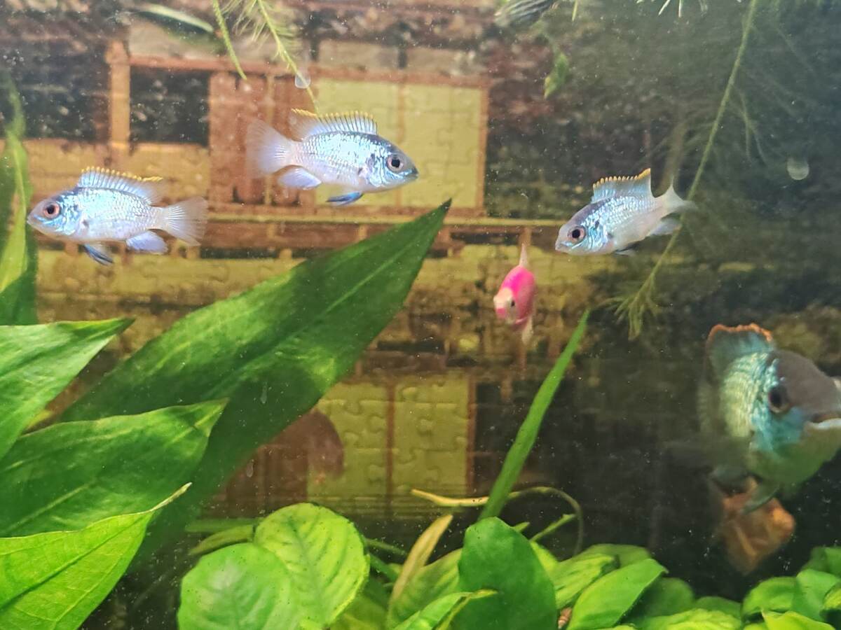 В данный момент у него несколько скалярий, 3 малька нанакары и одна взрослая, пара еллоу. Африка-Америка, всё вперемежку и всё хорошо. Территорию не делят, рыб помельче не едят.