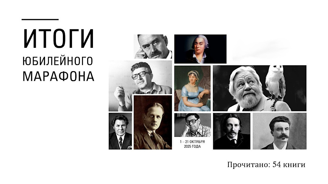 С 1 по 21 октября на канале «Библио Графия» проходил Юбилейный марафон. В течение трёх недель мы дружно читали книги десяти писателей-юбиляров 2025 года — Юрия Трифонова, Аркадия Стругацкого, Евгения Носова и Джеральда Даррелла, которым в этом году исполнилось бы 100 лет, 150-летних юбиляров Томаса Манна и Рафаэля Сабатини, 175-летних Ги де Мопассана и Роберта Льюиса Стивенсона, 250-летней Джейн Остин и совсем уж внушительного по возрасту, 300-летнего, Джакомо Казановы. Обожаю марафоны, в которых мы читаем книги определённых авторов. Всегда интересно посмотреть и осмыслить, кого читатели чаще выбирали и почему. В этот же раз количество авторов настолько большое, что я бы, наверное, совсем не удивилась, если до кого-то из них читательский взор так и не добрался. А он и не добрался в результате до... Впрочем, пойдём по порядку. В марафоне участвовало 24 человека. Это те читатели, которые не только стартовали, но и финишировали. То есть написали отзывы, поделились впечатлениями о прочитан