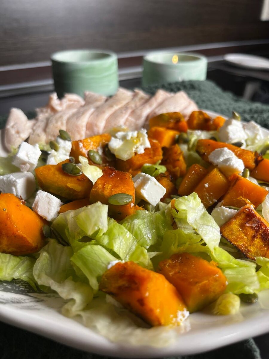 Если вы до сих пор не знаете, куда деть остатки тыквы из морозилки — этот салат вам точно понравится. Готовится за считанные минуты, а вкус — как в ресторане. Нам понадобится: • тыква — 150–200 г (у меня была замороженная, но подойдёт и свежая); • листья салата (подойдёт любая смесь, у меня — айсберг, половина кочана); • сыр фета или сиртаки — половина упаковки; • семена тыквы — горсть; • оливковое масло — немного для жарки и заправки. Если тыква свежая — лучше предварительно запечь её в духовке, чтобы стала мягче. Если замороженная — просто выкладываем на раскалённую сковородку с каплей оливкового масла. Жарим 3–4 минуты с одной стороны, переворачиваем и доводим до золотистой корочки. Дальше всё просто: на тарелку выкладываем листья салата, сверху — тёплую тыкву, кубики феты и немного семян тыквы. Поливаем оливковым маслом. Получается потрясающе вкусный, полезный и сбалансированный салат — лёгкий, но сытный. КБЖУ (на 100 г): 132 ккал • Б 5 г • Ж 9 г • У 6 г КБЖУ (на порцию ~250 г): 3