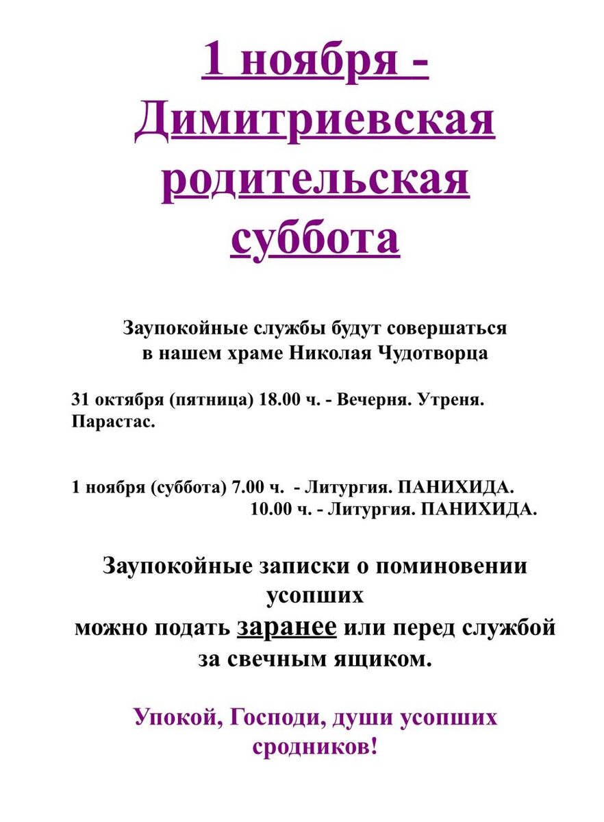 31 октября (пятница) Апостола и евангелиста Луки 18.00 – ВЕЧЕРНЯ и УТРЕНЯ (Парастас) Акафист Арх. Михаилу. ❗️❗️❗️ Димитриевская суббота день, когда поминают всех «от века (с начала времен) усопших» христиан. Димитриевская суббота – последняя родительская суббота в 2025 году❗️