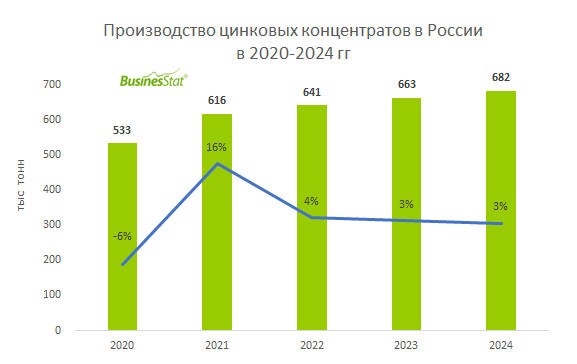В 2020-2024 гг производство цинковых концентратов в России увеличилось на 28% и достигло 682 тыс тонн.