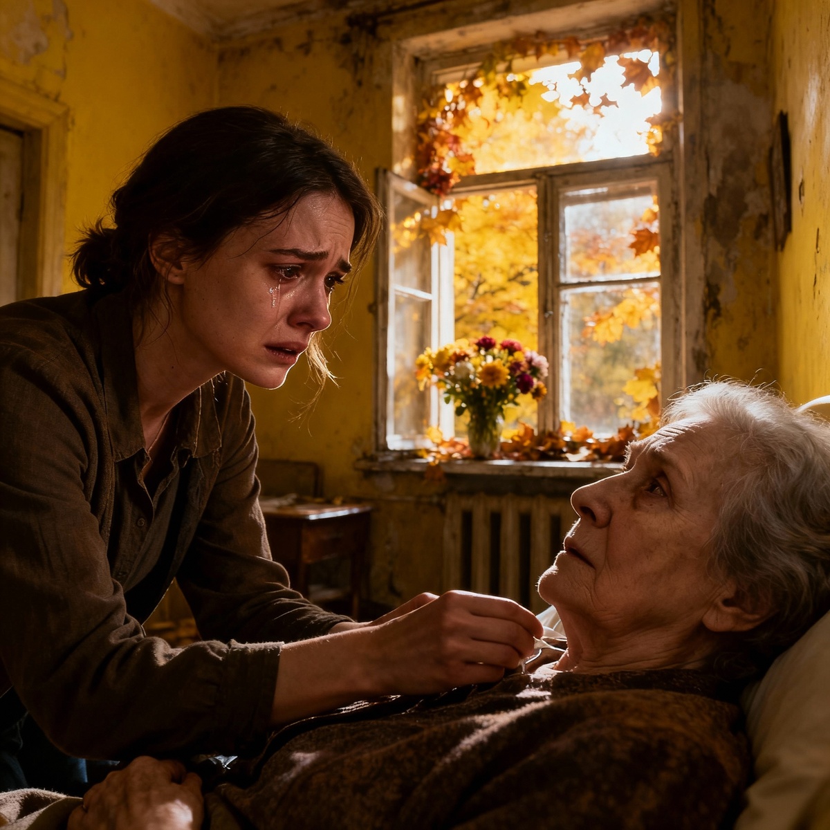 Сквозь мутное стекло старой хрущёвки тянулись жёлтые нити света — осень медленно переходила в зиму, оставляя на стекле следы дождей и ветра. На подоконнике стояли горшки с петуньями, уже полусухие. Эти цветы когда-то посадила бабушка Люба. Раньше она каждое утро выходила на балкон, поправляла листья, брызгала на них водой из старого пульверизатора и говорила: «Вот жизнь идёт — хоть в цветах немного радости осталось». Теперь этого не было. С каждым днём бабушка становилась всё слабее, а ухаживать за ней приходилось Насте.
