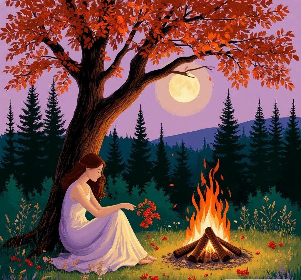 Шепот Предков в Велесову Ночь 🌙 Велесова ночь — славянский праздник с 31 октября на 1 ноября, когда бог Велес открывает врата между миром живых и царством духов, позволяя предкам делиться мудростью. По уральским преданиям, в эту пору в горах оживают древние тайны. В далёкие времена юная девушка из уральской деревни тосковала по погибшему отцу-охотнику. В туманную ночь она вышла к древнему дубу на склоне с мёдом и лепёшкой — подношением. "Велес, хранитель путей, верни свет отца!" — прошептала она, зажигая костёр для очищения. Из теней явился дух в облике волка с сияющими глазами. "Дитя, двери открыты, но путь — через прощение", — сказал он. Девушка бросила в огонь прядь волос — символ бед — и простила утрату. В пламени мелькнуло видение: счастливая жизнь, семья и процветание. К утру дух ушёл, оставив покой. Девушка стала знахаркой, помогая в такие ночи. Легенда учит: в Велесову ночь предки дарят надежду, если встретить тьму с открытым сердцем.