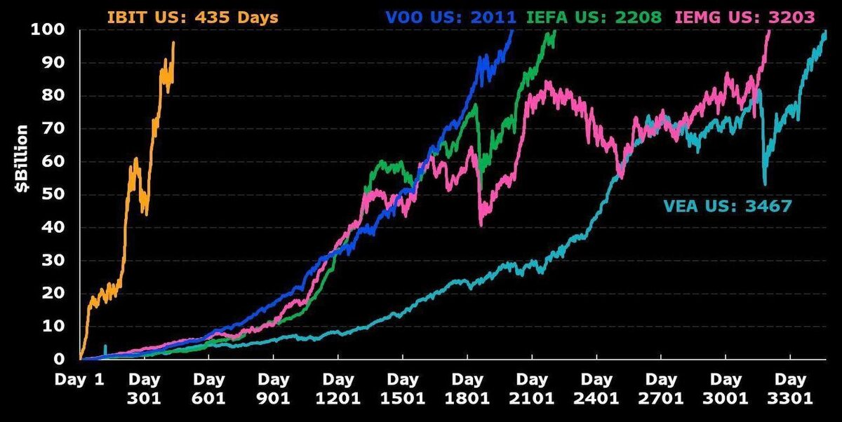 🚨 HOT OFF THE PRESS: 🇺🇸 BlackRock's Bitcoin ETF is set to smash records, heading toward becoming the fastest ETF ever to hit $100 billion in assets! 💰📈 #Crypto #Investing