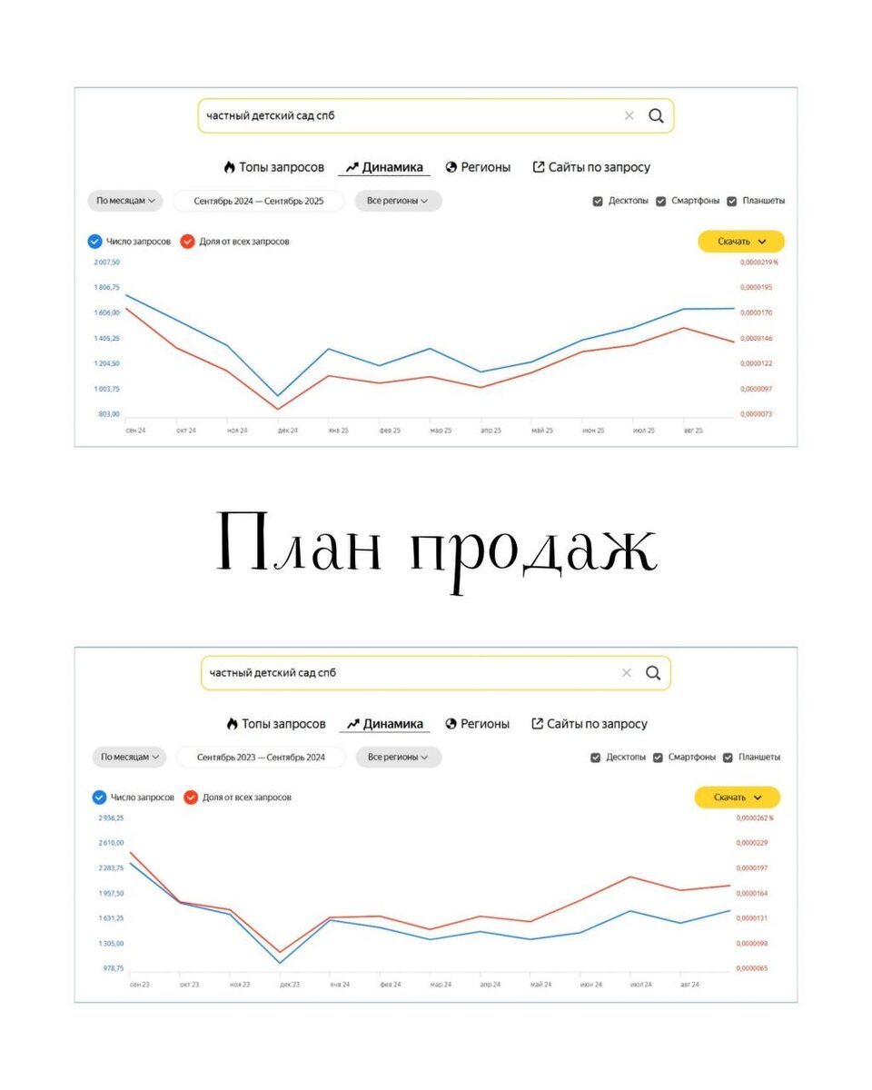 Зачем нужно вести статистику заявок и продаж? Для того, чтобы вести план продаж, независимо в crm или в табличке. План продаж выполняет важные функции: 📌Контроль расходов по рекламным кампаниям и распределения нагрузки по каналам. 📌Контроль работы администратора/управляющего (того, кто занимается продажами). Факторы, влияющие на показатели этих функций, необходимо анализировать в совокупности с обстановкой в мире и конкретно в вашем регионе. Все мы помним 2020 год, когда во время ковидного локдауна, спрос на частное образование !внимание! вырос! Родители были вынуждены переходить на удаленную работу из дома, а дети – вынуждены сидеть дома с ними же, потому что госсады были официально закрыты. Частное же образование (не все!) в тот момент по секрету, с нюансами, но выходило на работу раньше официального окончания карантина. Но вернемся в наши дни, когда из каждого утюга говорят о сокращении количества игроков в частном образовании. Именно поэтому сейчас особенно важно вести план прода