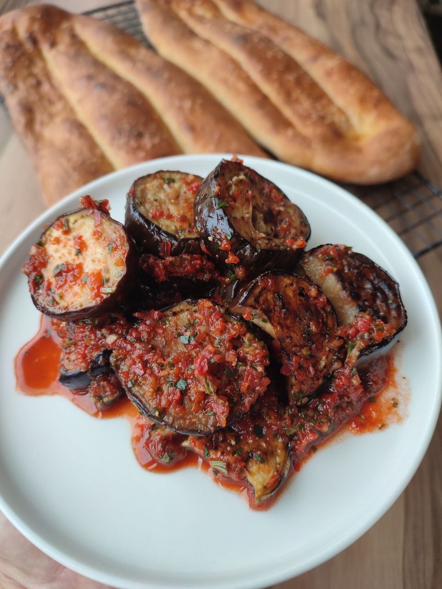 Мои любимые баклажаны в острой заливке и цельнозерновые лепешки! Красота! 🔥
