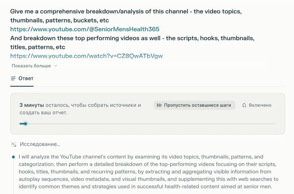 Напоминаю: Perplexity умеет «смотреть» YouTube видео Отправил его исследовать канал конкурентов, чтобы вытащить ключевые идеи, крючки и структуру сценариев. Понять, почему их ролики набирают сотни тысяч просмотров. Промпт для Perplexity: Give me a comprehensive breakdown/analysis of this channel - the video topics, thumbnails, patterns, buckets, etc [ссылка на канал] And breakdown these top performing videos as well - the scripts, hooks, thumbnails, titles, patterns, etc [ссылки на самые популярные видео] I want to emulate this channel as close as possible, give me an entire battleplan on how to do so. И напоминаю: Годовой PRO с браузером Comet можно купить за 3 копейки. Ссылка на покупку