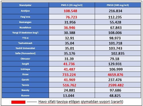 Жиззах ва Термиз шаҳарларида соат 15.00 ҳолатига ҳавода майда РМ—2.5 ва РМ—10 заррачалари йиллик миллий рухсат этилган меъёрий қийматлардан