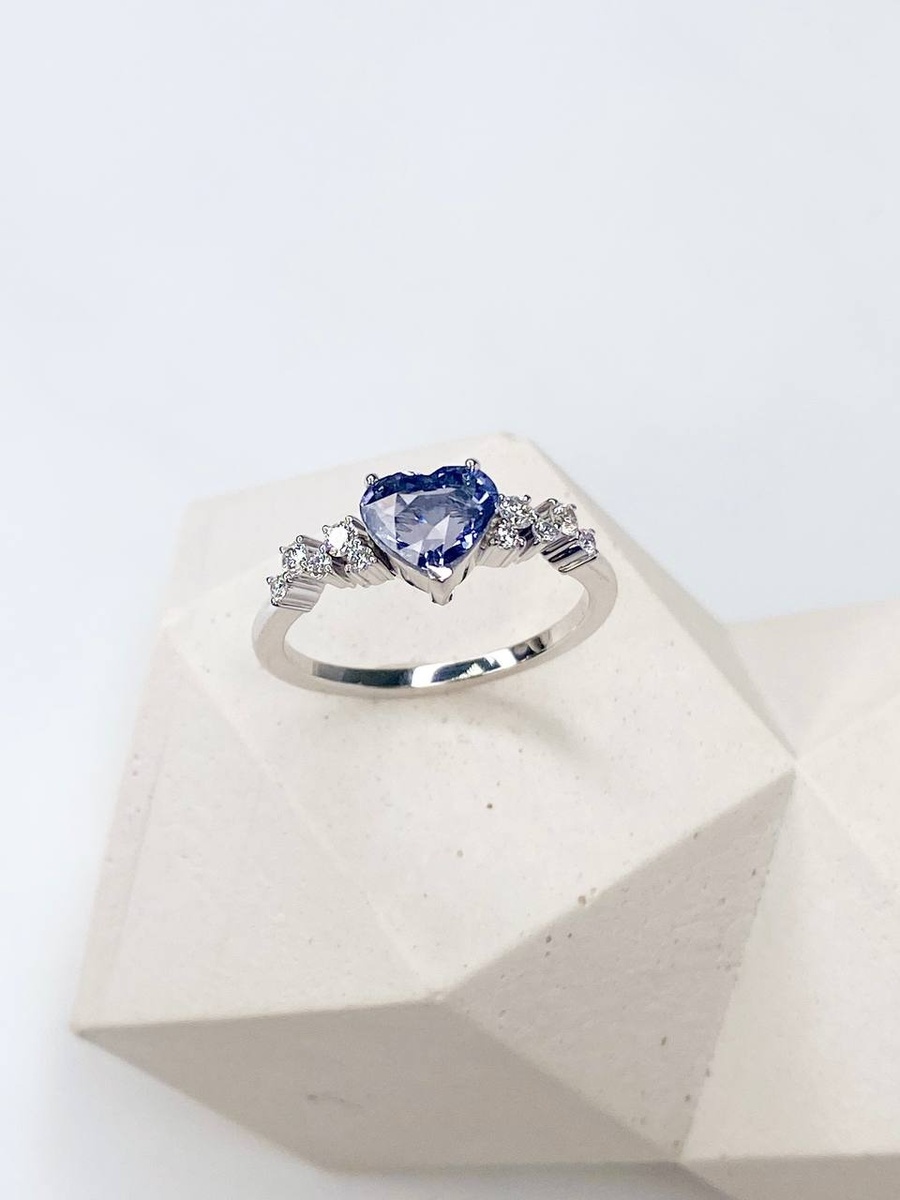 В центре украшения — шпинель, ограненная в форме сердца, весом 1,42 карата. Камень чистый, прозрачный, с холодным голубым оттенком, который красиво играет при разном освещении. При мягком дневном он спокойный и приглушенный, а при ярком вечерним расркывается более выразительными красками. С обеих сторон шпинель обрамляют четыре круглых бриллианта, которые придают дополнительный блеск.