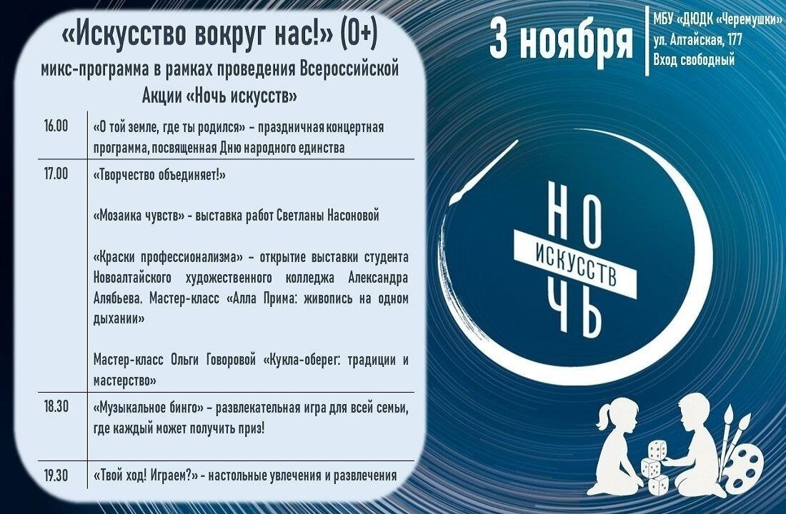 В Рубцовске Детско-юношеский Дом культуры «Черемушки» присоединяется к Всероссийской акции «Ночь искусств-2025» Здесь подготовлена разнообразная программа: 3 ноября в рамках акции пройдут выставки, мастер-классы, концерты и творческие встречи. Приглашают всех желающих окунуться в мир искусства и культуры, а также насладиться атмосферой творчества и вдохновения.