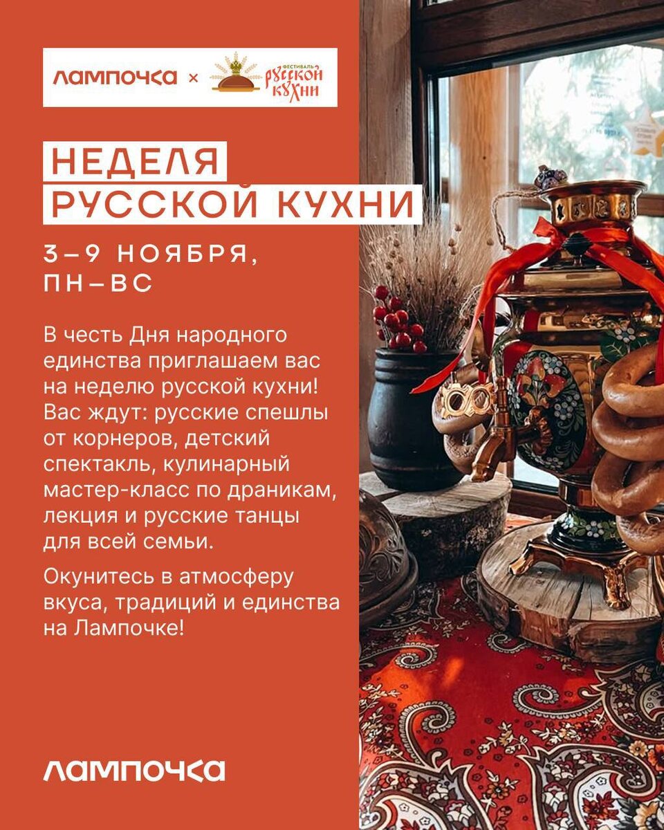 Неделя русской кухни в Лампочке 🍞 В честь Дня народного единства 3 ноября в Лампочке начинается неделя русской кухни. В программе: 🔹русские спешлы 🔹мастер-класс по драникам 🔹детский спектакль 🔹лекция 🔹русские танцы