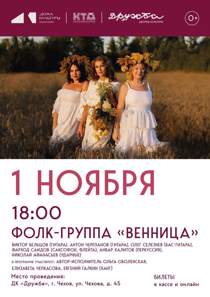 ✨ Концерт фолк-группы «Венница» в ДК "Дружба" Погрузитесь в мир русской души 😍 🎼Трио - Елена Каменская, Татьяна Дроздова, Елена Короткова - работает с разными музыкальными стилями исполняя авторские, народные композиции в современной обработке. Вы услышите экспериментальное сочетание глубины народной музыки, наполненное энергией мультижанровых импровизаций. 🎤 🎟️ БИЛЕТЫ в кассе Дворца культуры 🚫 Возраст: 0+ 📆 01.11.2025 🕛 18:00 🏢 ДК «Дружба» 📍 г. Чехов, ул. Чехова, д.45 💰 Цена от: 200 до 400 ₽ ⭐Поддержать канал голосом ✅ Мероприятия Чехов https://dzen.ru/id/66cc4b48e9ef144699238a51 http://vk.com/chekhov_events http://dzen.ru/chekhov_events