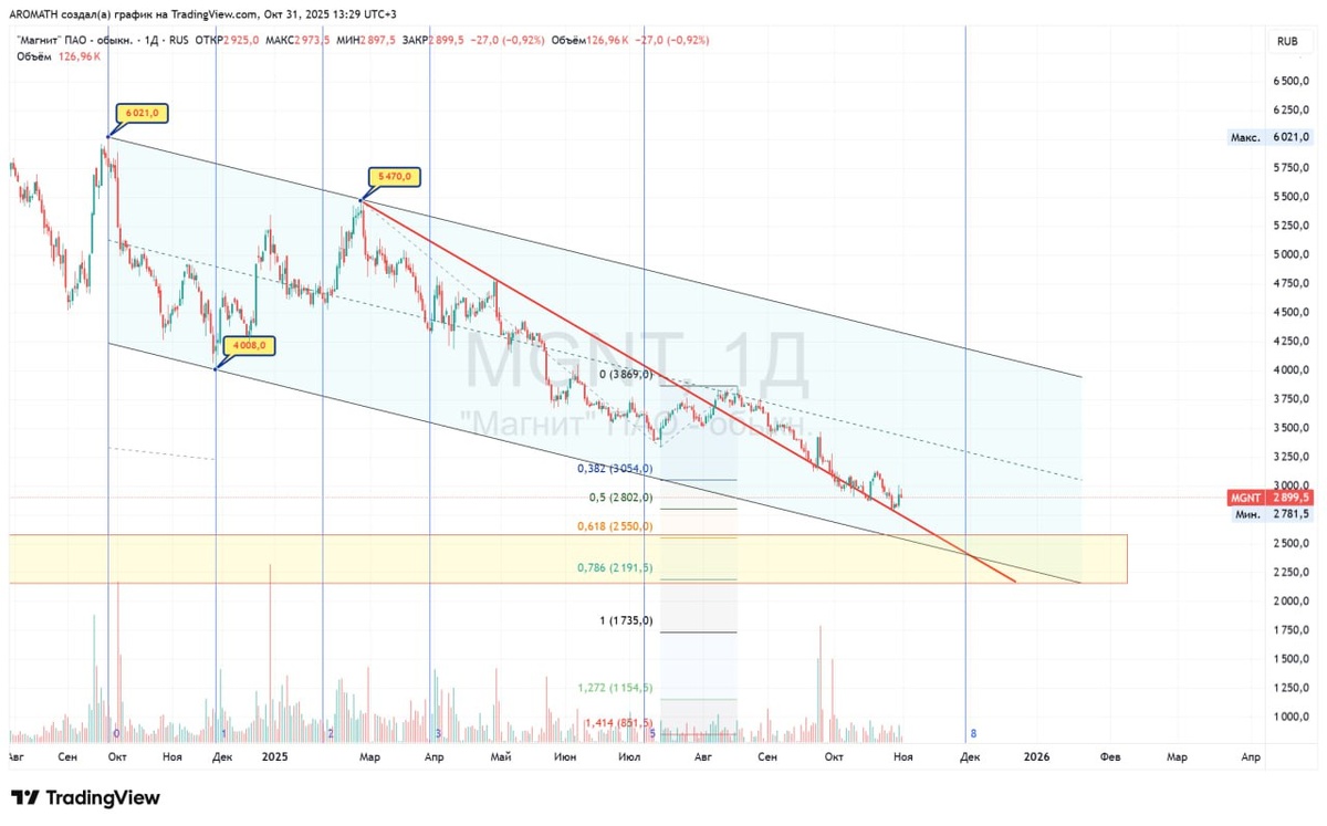 Ждем #MGNT Магнит на свой законный, горизонтальный и хорошо знакомый исторически уровень в диапазон 2100-2400. Не вышел вовремя - получил лося и полгода-год нездорового сна. И оно нам надо, такое? Нам точно нет. Мы так не делаем 💯 Уровень - это не одна цена, это ценовое скопление. Вот туда и примагнитимся 🧲 Судьбу Магнита повторяет давно #VTBR ВТБ вместе с другими слабыми акциями. Скорее всего, повторит уже и весь рынок за ними. Я, Вы, мы - все Магнит 🙈 Даунсайд посчитать по каждой акции? *** Предупреждал в июле еще, что #MGNT будет тонуть глубоко и тянуть всех за собой. https://dzen.ru/media/tradervip/rtkm-i-mgnt-dva-chudoaktiva-nadulisduli-6882593bd5aa9944a99aec49. #RTKM и #MGNT - два чудо-актива Надули-сдули. В обоих случаях можно ожидать обновления лоев 2022 года. Привет аналитикам, называется Напоминал в сентябре - https://dzen.ru/media/tradervip/-aktivnoe-namagnichivanie-investorov-i-analitikov-k-novym-loiam-proishodit-v-mgnt-magnite-vmeste-s-liubimoi-akciei-letnei-konfe